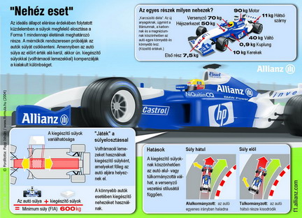 A Forma 1 mindennapjainak meghatroz eleme, hogy lland kzdelem van az idelis llapot elrse rdekben, amelyet tbbek kztt a slyok megfelel, egyenletes elosztsa is meghatroz. A legtbb aut slya az FIA (Fdration Internationale de l"Automobile = Nemzetkzi Automobil Szvetsg, a szerk.) ltal meghatrozott minimum rtk (600 kg) alatt van. Az gy kialakult klnbsget kiegszt slyokkal (volfrmacl lemezekkel) igyekeznek kompenzlni, s elrni ezltal a megfelel slyeloszts mrtkt is. Ez azonban plusz kltsgeket r a csapatokra: egy kszlet nehzfm lemez ra elri akr a 40.000 eurs rtket.